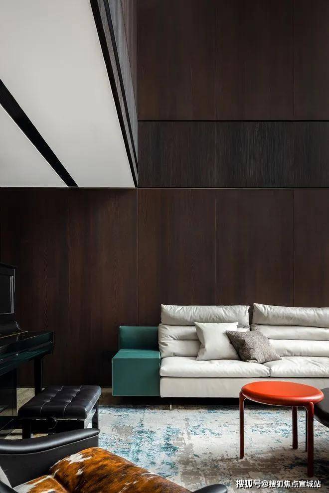 会客厅同样贯穿了大客厅的林芝橡木墙体,嵌入了复古的金属铜岩板作为电视墙,呈现出一种内敛的质感。优质的米白色皮革沙发搭配不锈钢支撑脚,将视觉向下延伸。