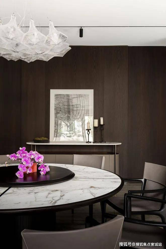 电视墙采用了大理石材质,与木纹纵向分割,空间得到了延伸。整体的构架舒展而平衡,透着沉稳平和的气质。